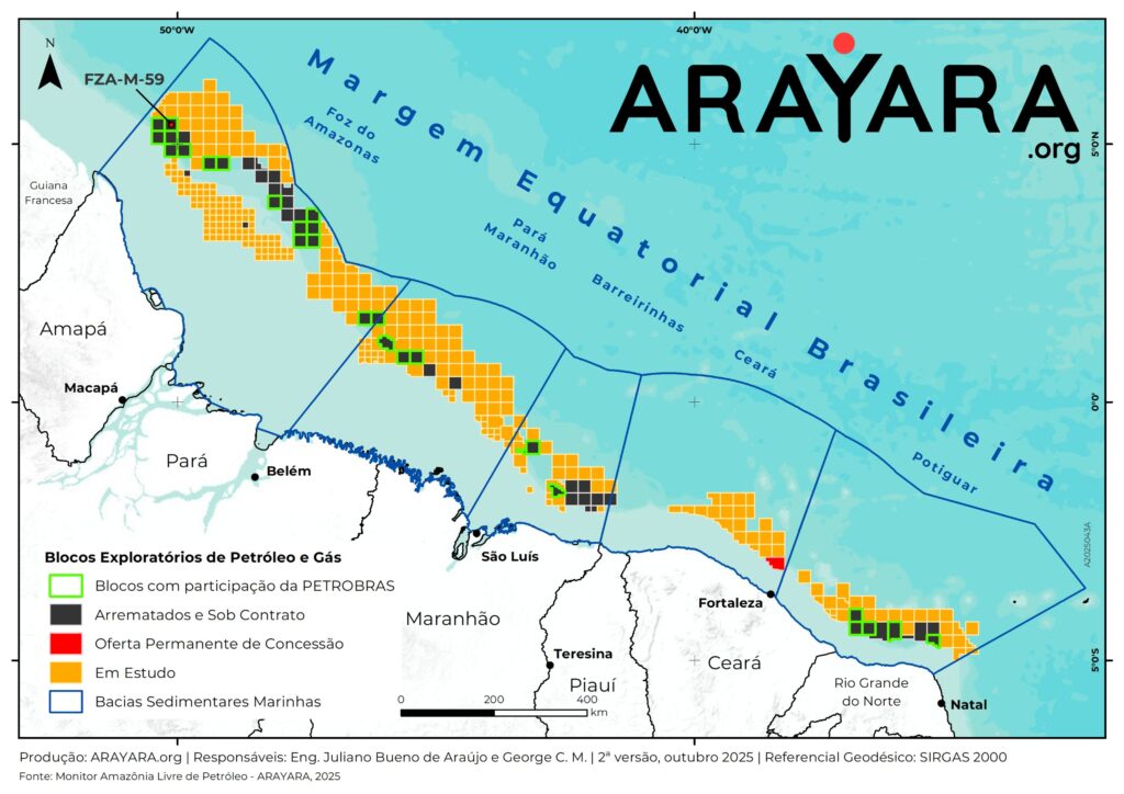 O bloco FZA-M-59, que abriga o poço de Morpho (onde os trabalhos de perfuração já começaram, segundo a Petrobras), é apenas o primeiro de uma série na bacia da Foz do Amazonas. Há outros oito blocos em licenciamento e 19 arrematados no leilão da ANP em junho. A abertura de uma nova fronteira exploratória do petróleo via liberação do bloco FZA-M-59 implicará, em plena crise climática, aumento na produção de combustíveis fósseis, que, por sua vez, elevará as emissões de gases de efeito estufa no país e no mundo.